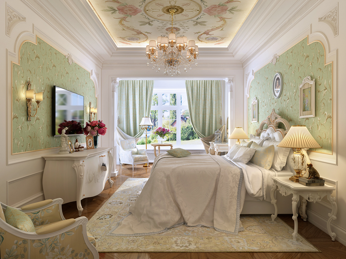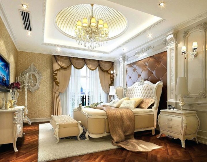 Klassischer Stil impliziert ruhige Töne, traditionellen Stuckfries, vergoldet. In der luxuriösen Innendecke kann mit Fresken oder Caissons dekoriert werden. Gleichzeitig sollte der gesamte Rest des Schlafzimmers dem Niveau der Decke entsprechen.