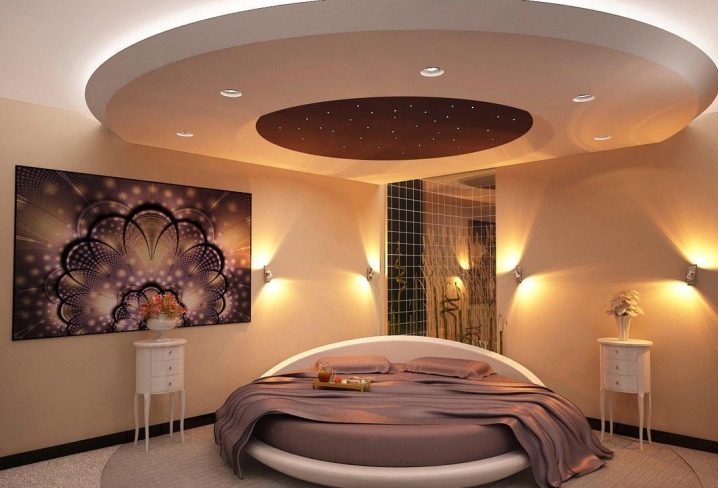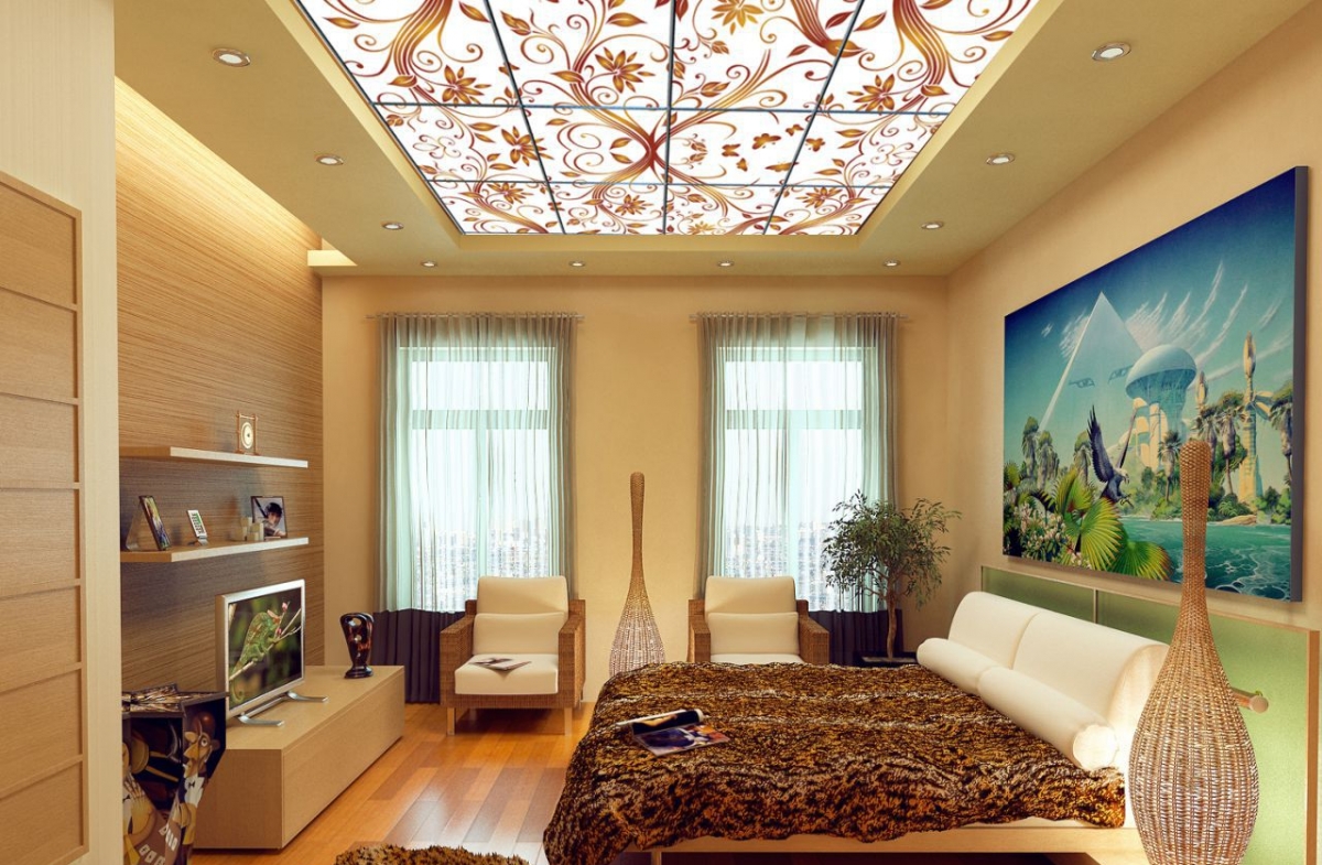 Die Registrierung des Deckenraums kann alles Mögliche sein. Bei der Wahl des Designs müssen Sie sich in erster Linie auf Ihre persönlichen Vorlieben und natürlich Ihre finanziellen Möglichkeiten konzentrieren. Das Design der Decke sollte im Einklang mit dem gesamten Stil des Raumes sein. Nur in diesem Fall können Sie eine angenehme und angenehme Atmosphäre im Schlafzimmer schaffen.