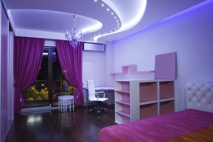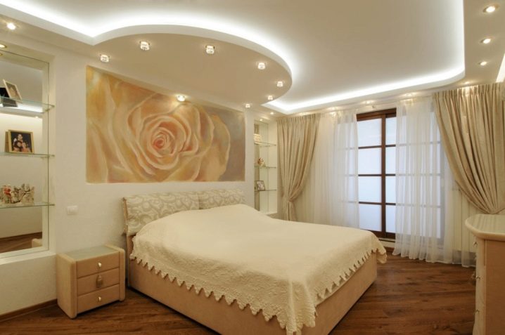 Mehrgeschossige Decken sollten nur dann ausgeführt werden, wenn die Parameter des Raumes groß genug sind, um die hängenden Elemente aufzunehmen.Aber in kleinen Schlafzimmern mit niedrigen Decken ist besser, das Design in einer Reihe, Fransen curly Frame zu machen. Trockenbau - ein praktisch universelles Material: Abgehängte Decken können nicht nur eine beliebige Form haben, sondern auch abgewinkelte Ecken aufweisen oder, wenn es das Design erfordert, geneigt oder geneigt sein.