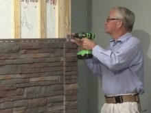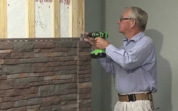 Wir dürfen die Kontrolle der Lücken zwischen den Elementen nicht vergessen. Das Zusammenfügen der Platten mit dem Winkel sollte sehr sorgfältig erfolgen, da die Korrektheit dieser Arbeit davon abhängt, ob die Struktur mit einer möglichen Verschiebung oder Erweiterung der Außenwand verformt wird. Für die Befestigung werden Nägel oder Schrauben verwendet, sie müssen im rechten Winkel liegen, und es wird empfohlen, einen Träger zu verwenden. Ferner die Bildung von Reihen. Es ist notwendig, dem Zufall des Musters zu folgen, damit das Mauerwerk so natürlich wie möglich aussieht. Relativ zur vorherigen Reihe der Platte sollte um 15 Zentimeter verschoben werden.