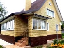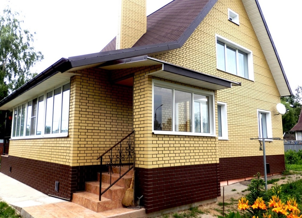 Darüber hinaus kann "unter dem Ziegelstein" teilweise sein. Mit der richtigen Idee sieht eine Kombination aus einfacher und Kellerverkleidung vorteilhaft aus, die der Struktur eine originelle und einzigartige Erscheinung verleiht.So kann das Material das gesamte Gebäude umhüllen und seine visuelle Wahrnehmung komplett verändern. Mit einem vollständigen Ende kann ein hölzernes Haus leicht in eine Ziegelsteinversion umgewandelt werden und ihm Art und presentability geben.