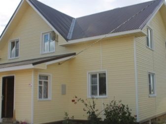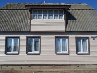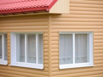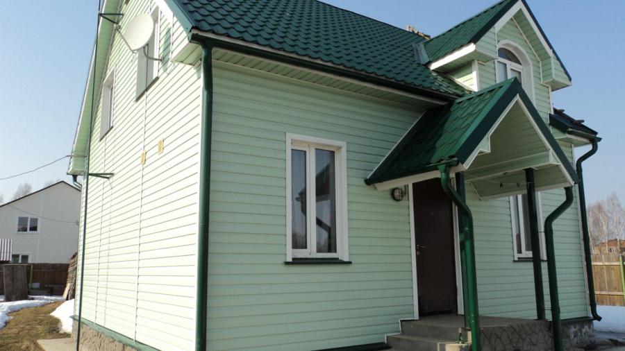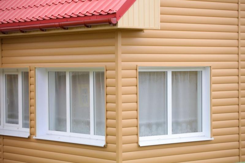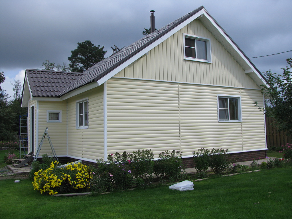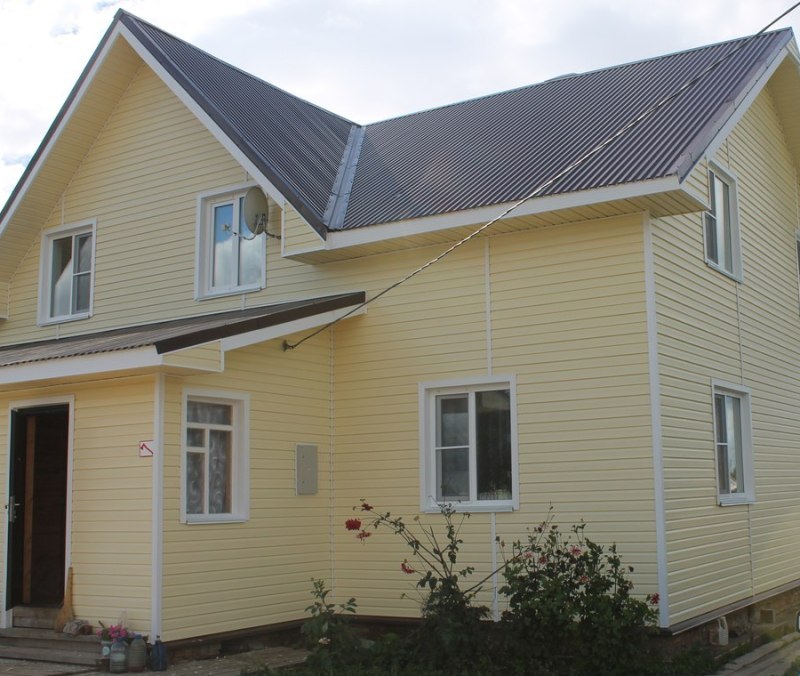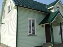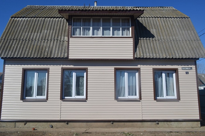 Klassische Vinylverkleidung, die durch Paneele dargestellt wird, die das Aussehen eines Schiffes nachahmen. Die Verarbeitung mit einem solchen Material verleiht der Fassade ein strenges, zurückhaltendes und ästhetisch ansprechendes Aussehen.