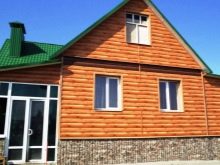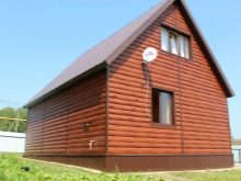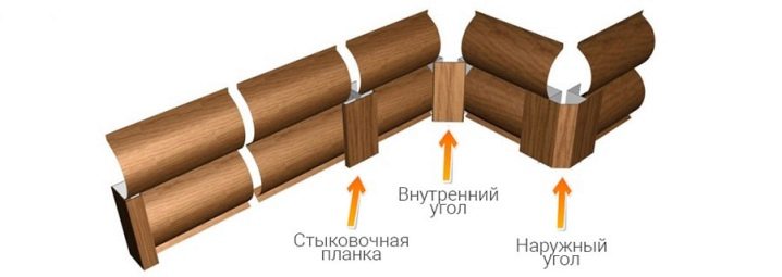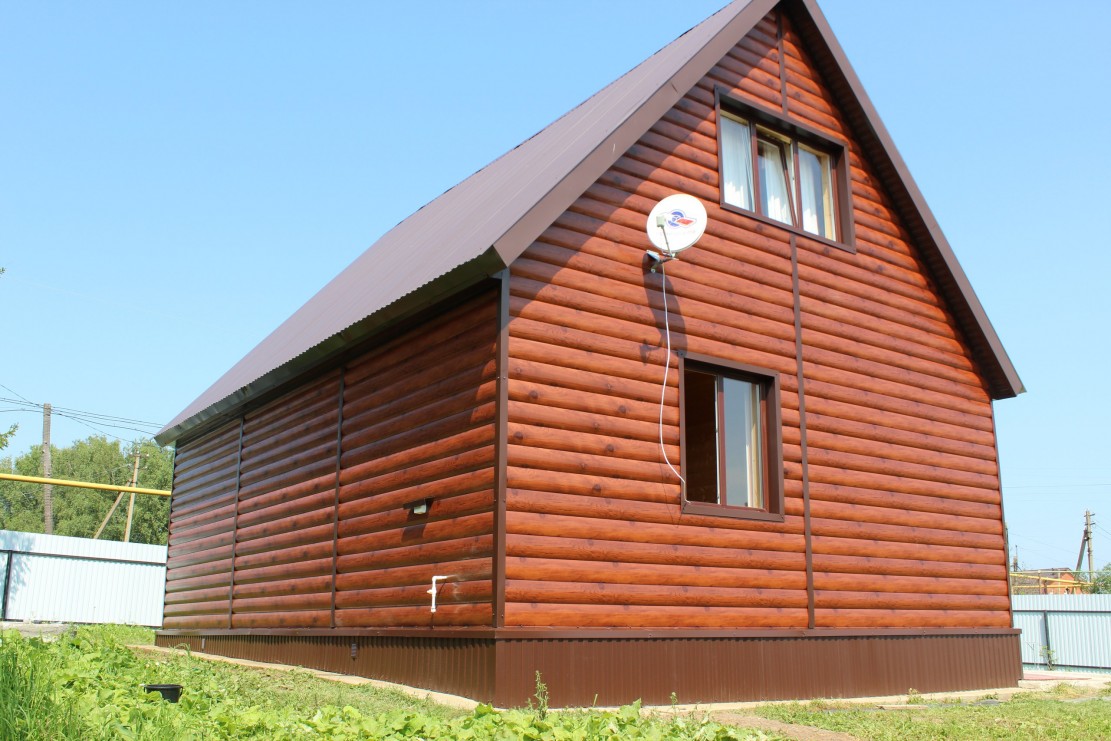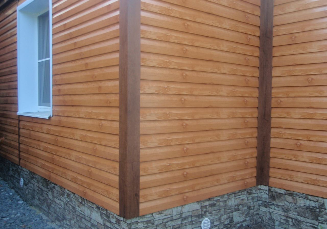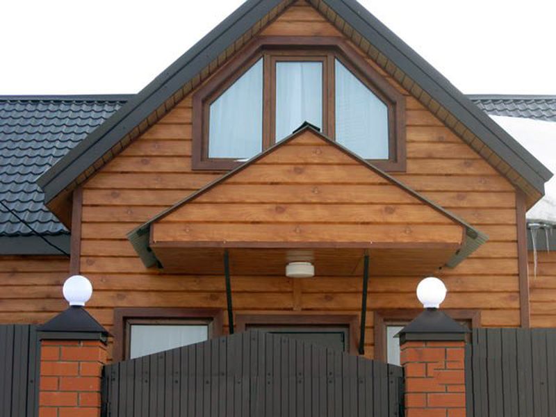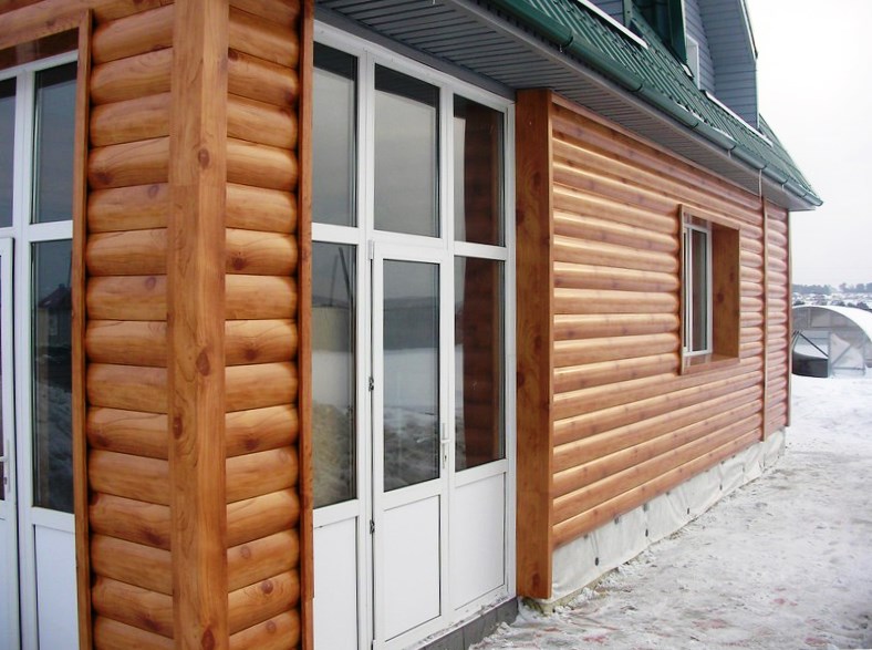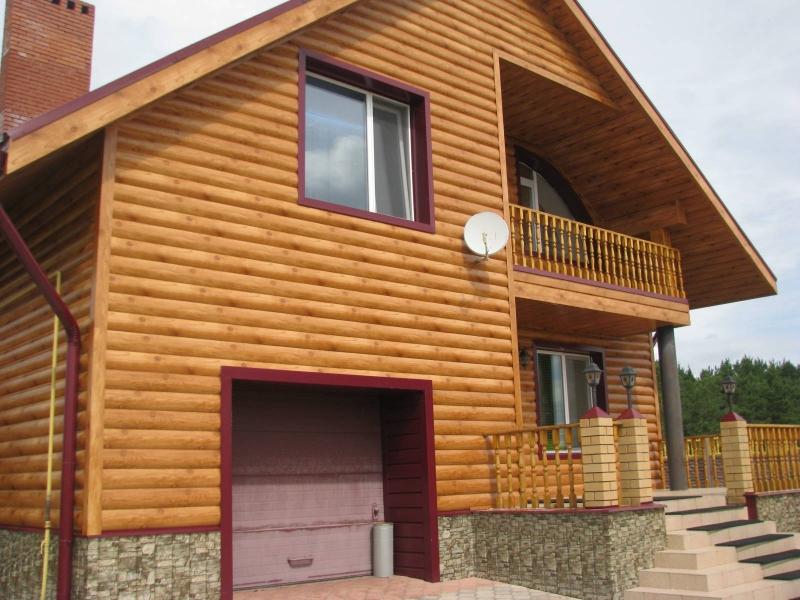 - Besonders beliebt war die Gestaltung der Fassade im Blockhausstil (vom englischen Blockhaus, wörtlich: ein gehobeltes Brett), das den Anschein eines Gebäudes aus Rundholz wiedergibt. Ein realer Baumstamm wird in der Regel mit der Technologie "Quadrat im Kreis" so bearbeitet, dass die Oberfläche eine gerade untere und eine obere halbrunde Krümmung aufweist. Metallverkleidungen für eine Blockhausbiegung und geben ihm eine ähnliche Form. Nach Fertigstellung des in Form und Farbe kopierten Materials erhält das Haus die Form eines Blockhauses.