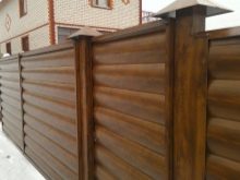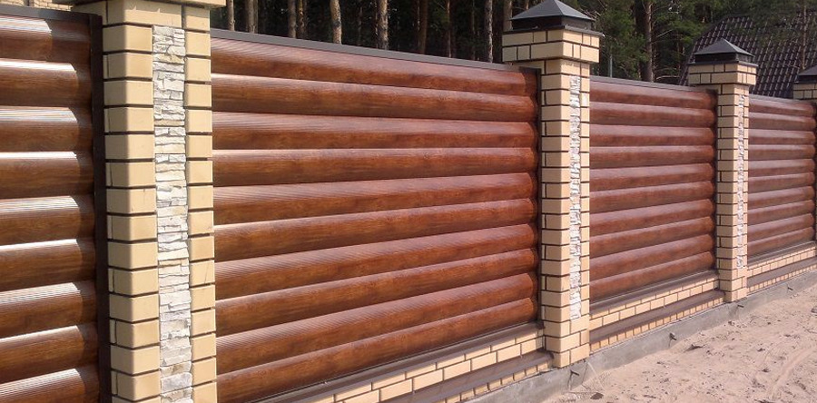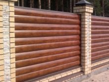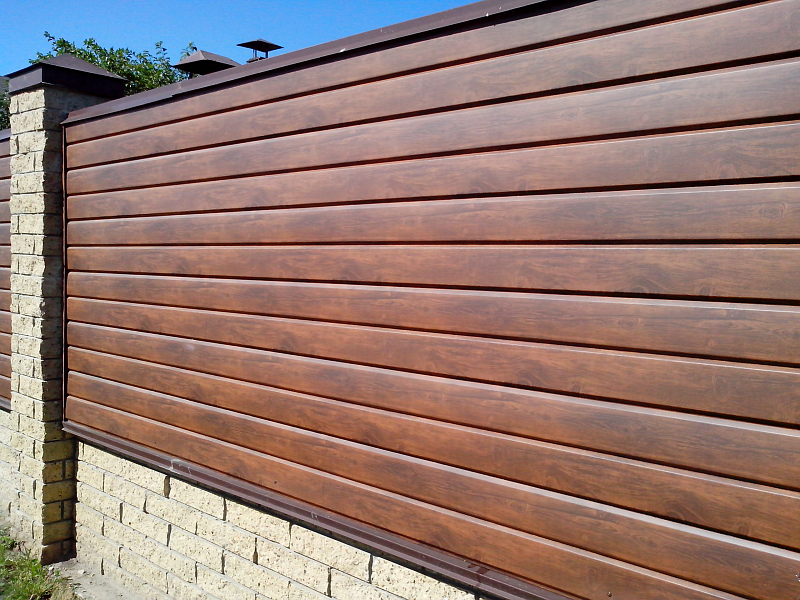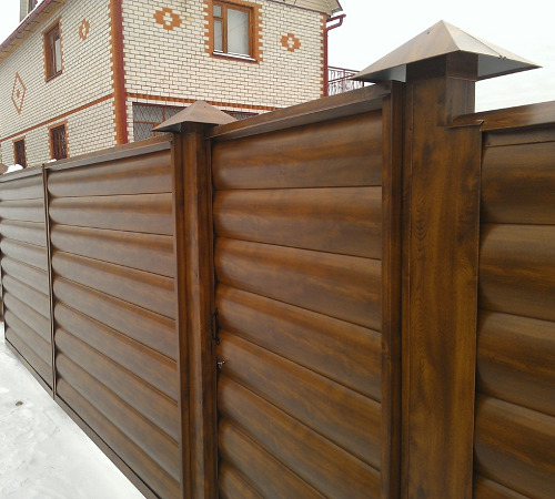 - Es ist eine nicht-triviale Lösung, Teile des Zauns mit einer neuen Art von Verkleidungen zu füllen, die die Zuverlässigkeit des Metalls und die Schönheit des Holzmusters kombinieren, das die Baustelle zuverlässig vor neugierigen Blicken schützt. Die Installationsfreundlichkeit bleibt erhalten, da der zeitaufwendigste Schritt die Installation intersektionaler Halterungen ist. Das Füllen der Öffnung ist ein ziemlich einfacher Vorgang, da es nicht notwendig ist, Eckverschlüsse zu montieren und eine große Anzahl von Übergangsstangen zu sichern.
