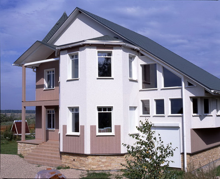 PVC oder Vinylverkleidung ist ein Streifen aus Kunststoff einer bestimmten Form. Sie sind einfach zu benutzen während der Installation, weil sie spezielle Schlösser haben, durch die sie leicht miteinander verbunden werden können. Vinyl-Fassaden können mit selbstschneidenden Schrauben an der Hausfassade befestigt werden, für die eine spezielle Montagekante mit Löchern vorinstalliert ist. Mit diesem Material können Sie Ihr Haus dekorieren und es wärmen.
