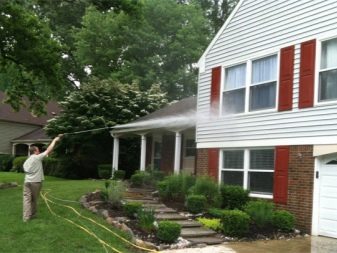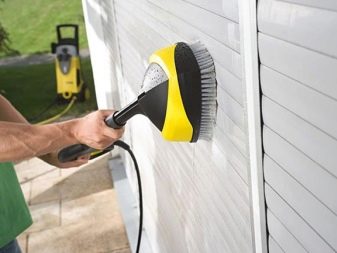 Die Pflege von Verkleidungsplatten ist einfach. Es genügt, sie von Zeit zu Zeit mit Wasser mit einer nicht aggressiven Seifenlösung abzuwischen. Auf Wunsch und bei starker Verschmutzung können Sie Karcher verwenden - ein spezielles Gerät, das Wasser unter hohem Druck liefert und ein Strahl buchstäblich die Verschmutzung von den Oberflächen wegdrückt. Bei Karcher müssen Sie jedoch vorsichtig arbeiten, da Sie die Paneele versehentlich beschädigen und somit ruinieren können, insbesondere bei Metallverkleidungen.