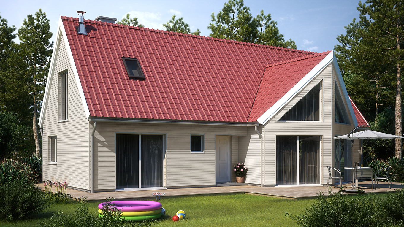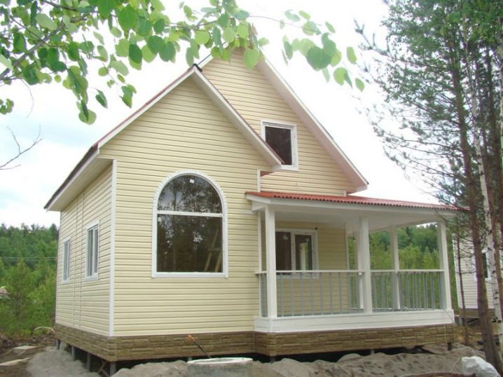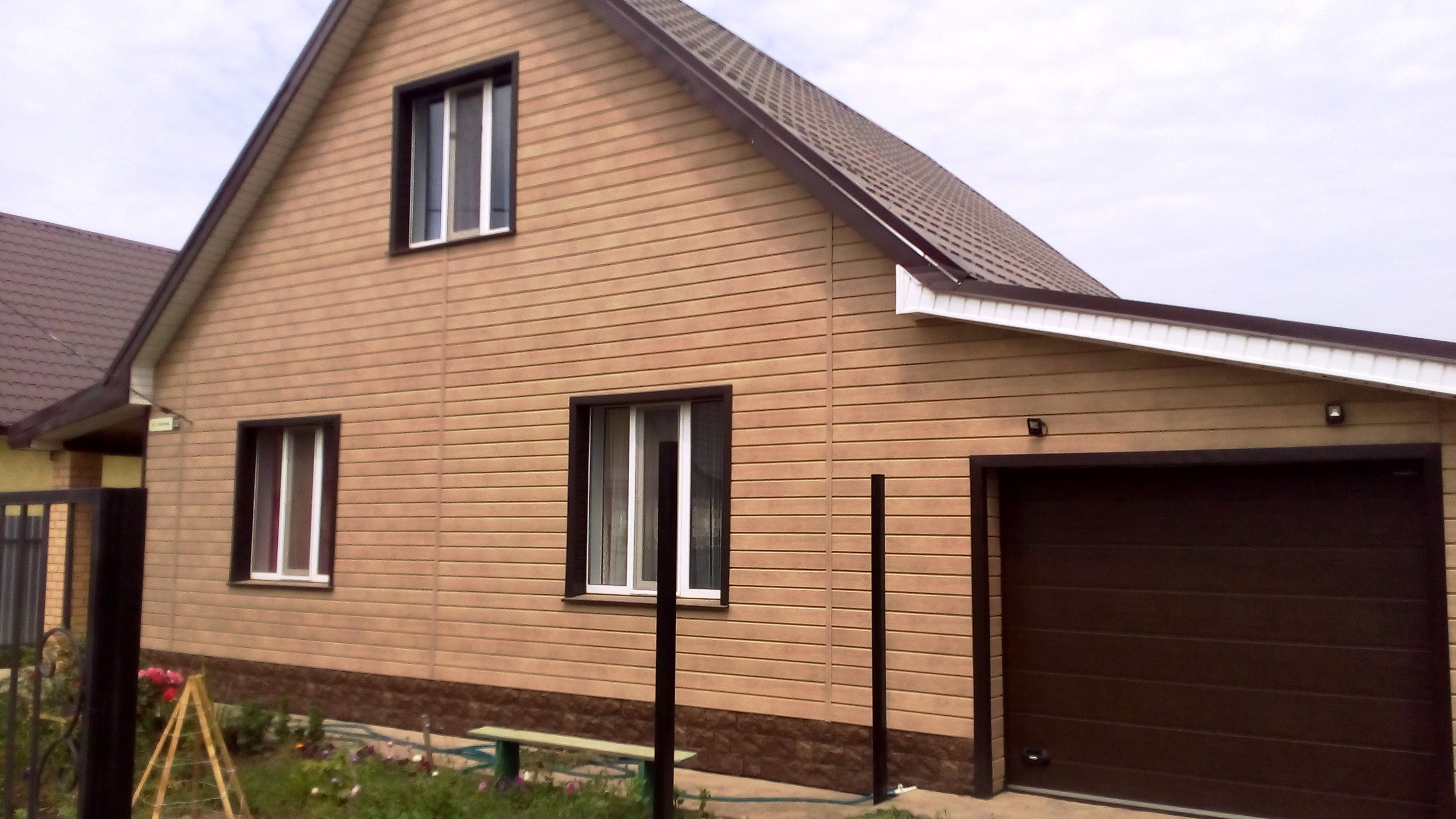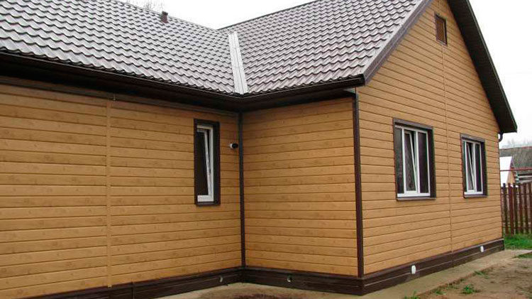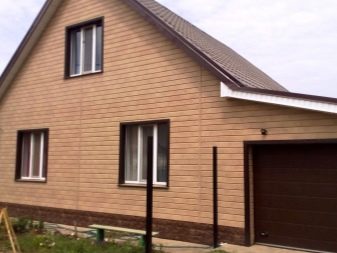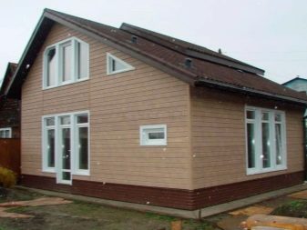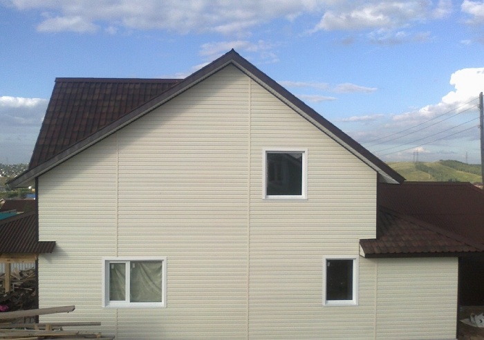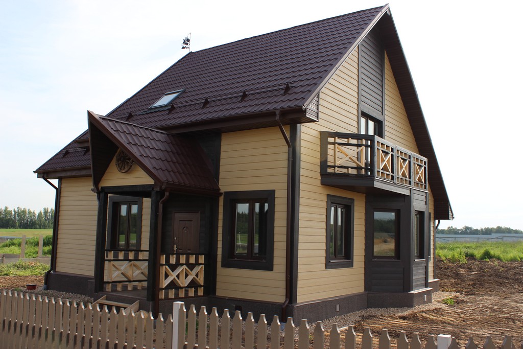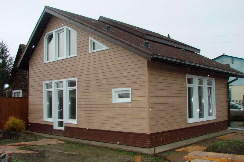 Die Wände des Hauses können mit klassischen hellen Paneelen, zum Beispiel Sand, dekoriert werden. Gleichzeitig setzen Eck- und Fensterelemente einen kontrastierenden Farbton ein.