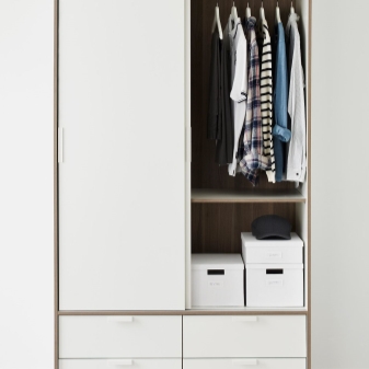 - Manchmal kombinieren Produkte Abteile mit Flügeltüren und Schubladen. Solche Schränke sind klein und kompakt, aber gleichzeitig enthalten sie ziemlich viele Kleidungsstücke.