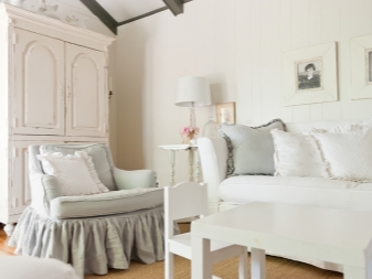 Der Innenraum in hellen Farben sieht immer hell, sauber und sogar ein wenig feierlich aus. Die logische Lösung für dieses Interieur ist die Wahl der weißen Möbel. Um einen geräumigen, komfortablen und schönen Stauraum im Wohnraum zu schaffen, werden Schränke verschiedener Konfigurationen verwendet. Das weiße Gehäuse ist ideal für jedes Interieur, es schneidet den Raum nicht ab und überlastet ihn nicht. Die weiße Farbe der Schrankoberflächen erfordert keine besondere Pflege, sie passt gut zu anderen Texturen und Farben.