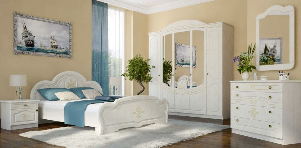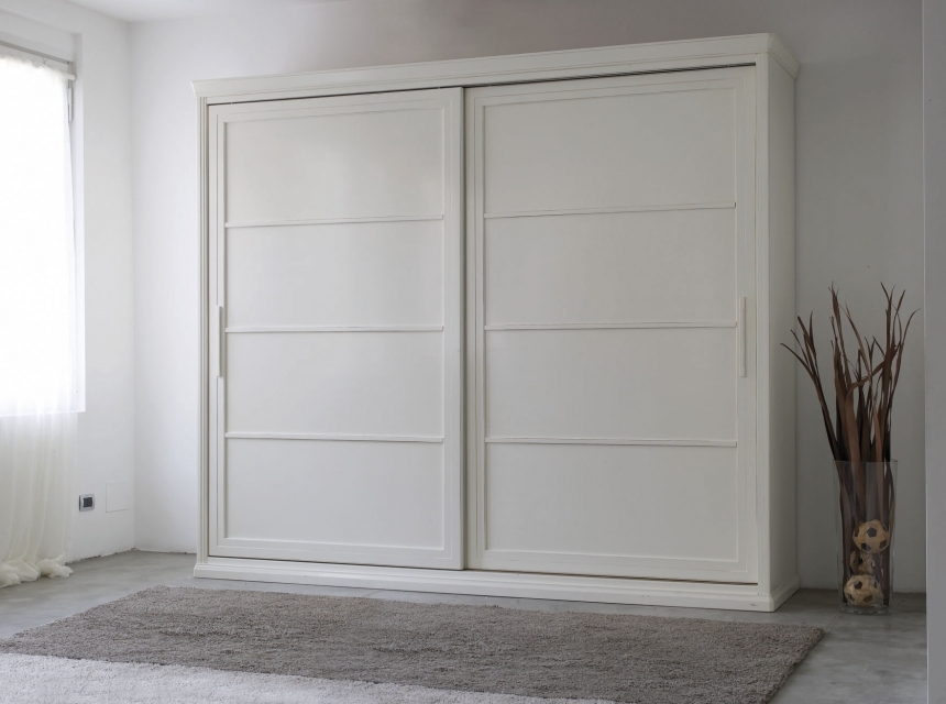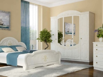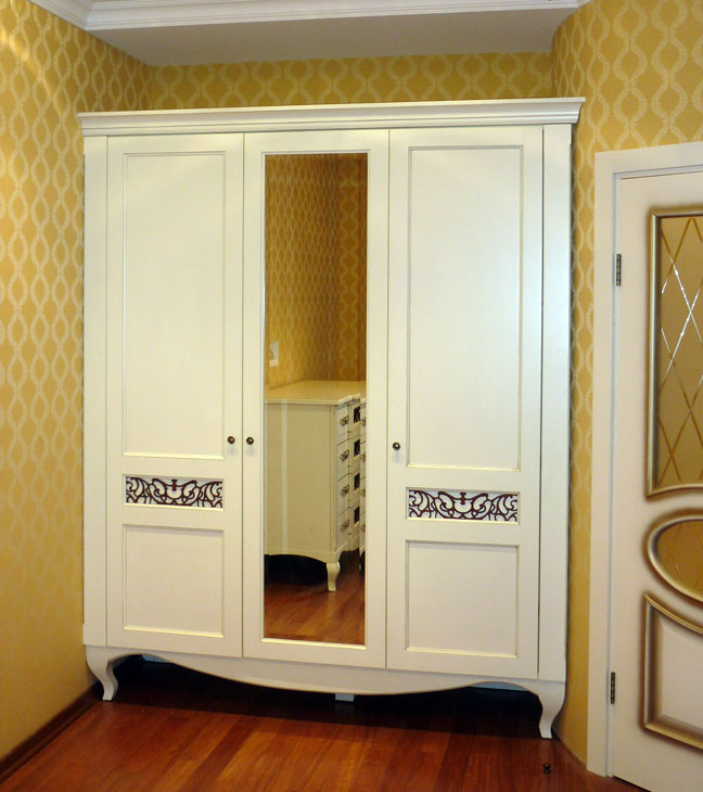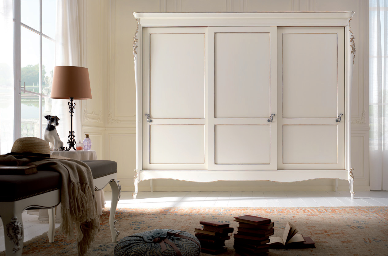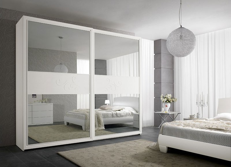- Im Schlafzimmer. Das Schlafzimmer ist ein Ort zum Entspannen, daher verleiht die weiße Farbe diesem Raum einen besonderen Charme, Zartheit und Komfort. Wenn der Schlafraum groß genug ist, können Sie einen schönen Schrank mit Flügeltüren platzieren. Im klassischen Interieur dient eine Garderobe aus edlem Material - Holz nicht nur als Ablage im Schlafzimmer, sondern dient auch als Dekorelement des Raumes. Wenn die Abmessungen des Schlafzimmers begrenzt sind, dann können Sie den Schrank mit Schiebetüren, eckig, schmal in der Breite, aber mit einem Zwischengeschoss betreten.