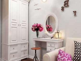 Die weiße Farbe macht aus einem eher sperrigen Element ein leichteres. Dies liegt daran, dass die Farbe die recht großen Abmessungen des Gehäuses ausgleicht. Es scheint nicht so groß und auffällig, zieht nicht alle Aufmerksamkeit auf sich, verletzt nicht die Proportionen des Raumes. Ein solcher Schrank passt perfekt in jedes Zimmer.