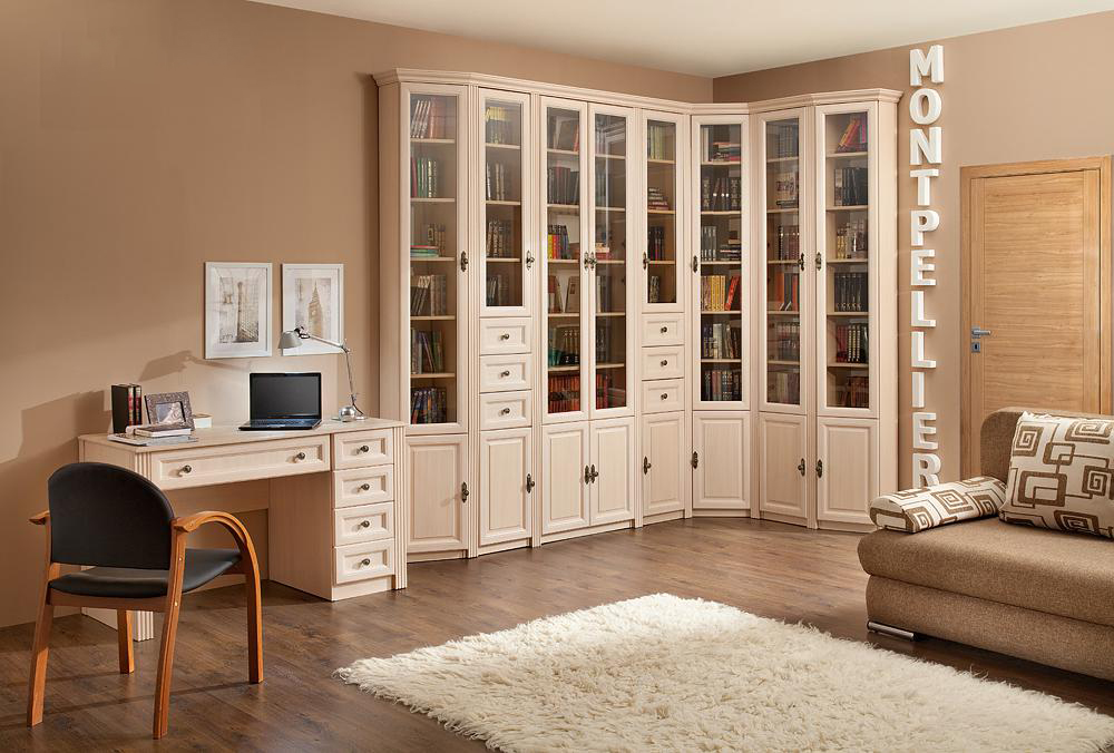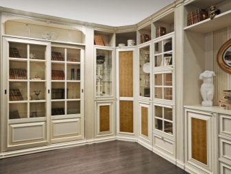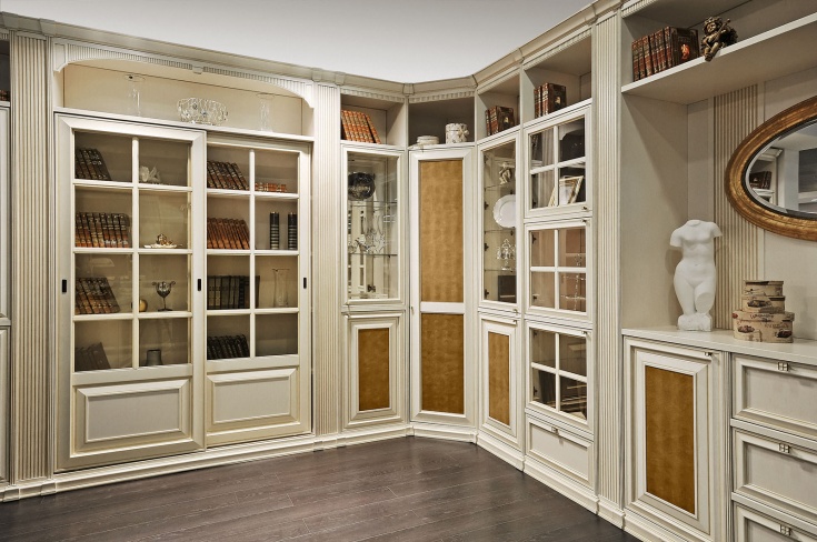 - Im Wohnzimmer. Im Wohnzimmer können Sie Modelle offen mit Regalen, geschlossen mit Türen oder einer Kombination von ihnen platzieren. Geschlossene Schränke können mit Glastüren sein und sie werden Ladenfronten genannt. Sie sind für Geschirr und Dekoartikel gedacht.