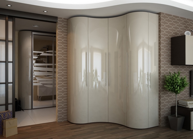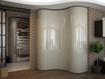 Wenn die Türen eines solchen Schranks gespiegelt sind, sind keine zusätzlichen Spiegel erforderlich. Diese Technik wird den Raum, der für kleine Räume wichtig ist, weiter ausbauen. Es ist auch praktisch, einen Eckschrank im Korridor anzuordnen, der die "tote Zone" des Raumes rationell nutzt und auf Kosten der weißen Farbe den Raum heller macht.