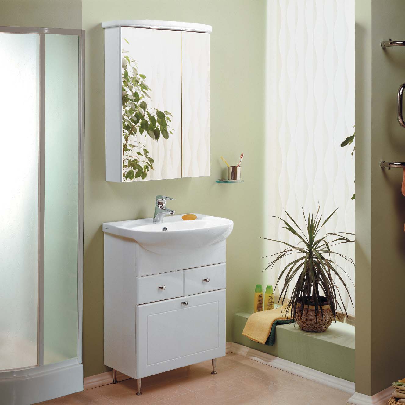 Ein Schrank aus einem Material mit einer glänzenden Oberfläche oder mit einer gespiegelten Tür wird auch arbeiten, um den visuellen Raum zu erhöhen und es zu beleuchten.