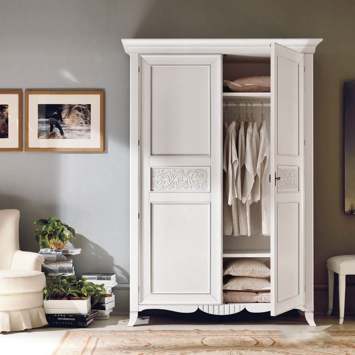 - Chebbi Chic - für Liebhaber des antiken Luxus. Hier ist Weiß die Grundlage für die Gestaltung des Raumes. Die Garderobe mit dem "Hauch der Antike" wird sich perfekt in das Interieur dieses Stils einfügen.