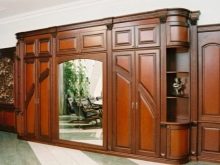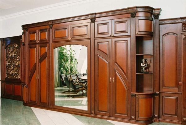 Große Schränke werden sehr selten in kleinen Räumen installiert, da sie viel Platz einnehmen. Diese Produkte werden aus massiven Blöcken hergestellt und aus mehreren Modulen zusammengesetzt.