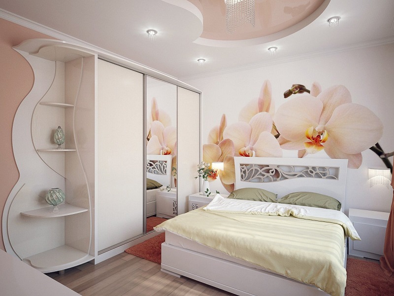 - Das Schlafzimmer. Dies ist einer der wichtigsten Orte, an denen solche Möbel zu finden sind. Wenn das Zimmer geräumig ist, können sie in verschiedenen Variationen arrangiert werden. Am einfachsten ist es, hinter dem Rücken oder an der Seite des Bettes zu installieren. Eine interessante Lösung wird Eckschrank in Form des Buchstaben "P" aussehen. In dieser besonderen Nische können Sie ein Bett arrangieren oder ein kleines Ankleidezimmer organisieren.
