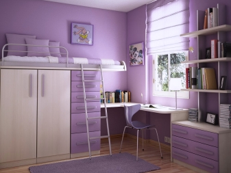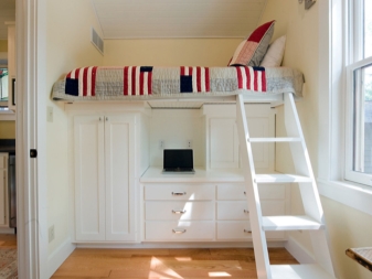 Sie können ein modernes Hochbett kaufen. Ein Bett in solchen Modellen befindet sich auf der zweiten Ebene, während ein geräumiger Kleiderschrank darunter platziert werden kann.