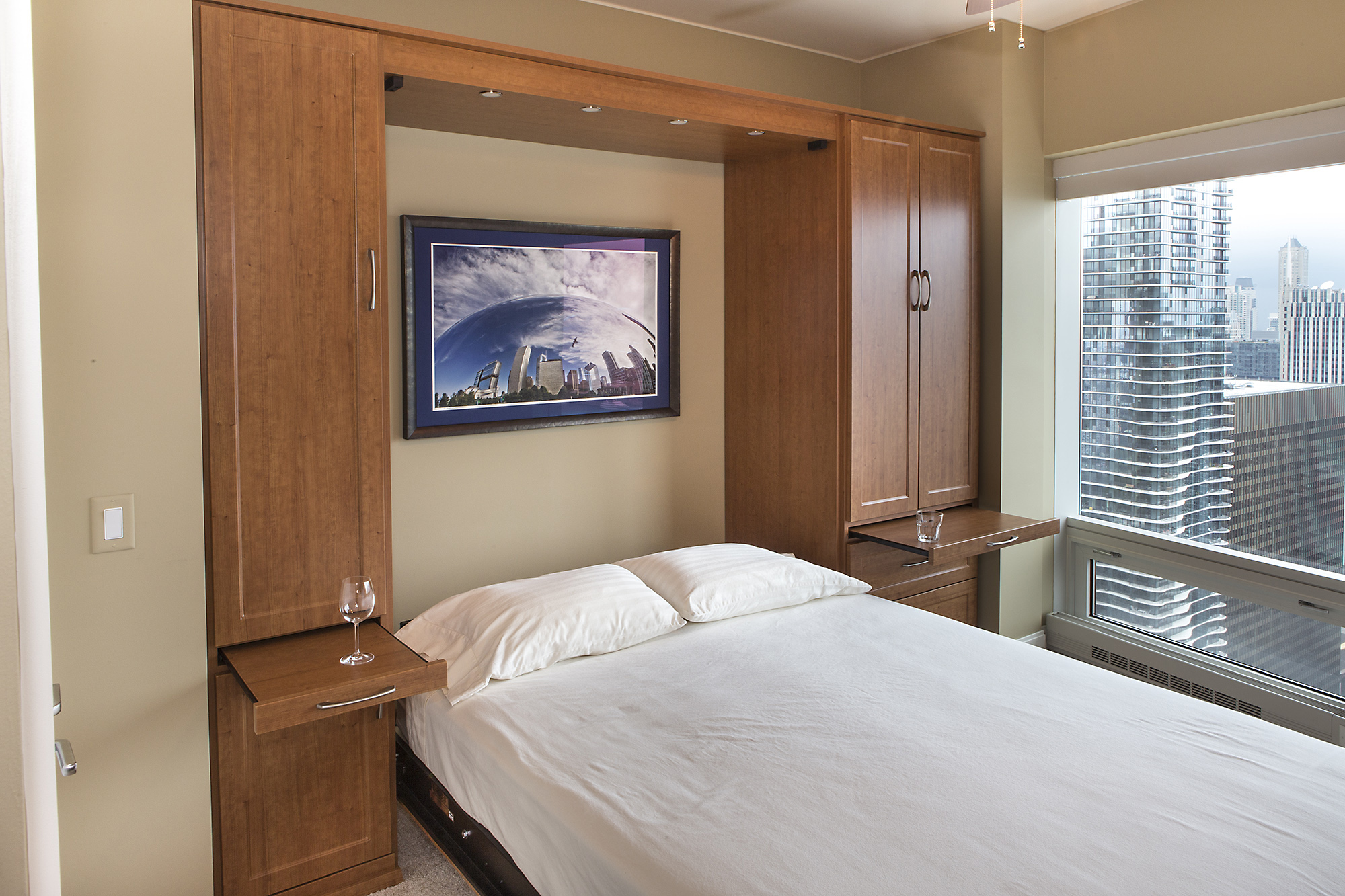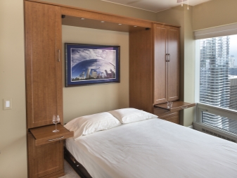 Eine weitere sehr interessante und ungewöhnliche Version der Möbel, die auch für einen kleinen Chruschtschow geeignet ist – funktionaler Bett-Kleiderschrank. Während des Tages schläft und zieht sich das Bett in den Schrank zurück, wodurch Sie den Raum wesentlich frei machen können und sich nachts wieder in ein bequemes und geräumiges Bett verwandeln.