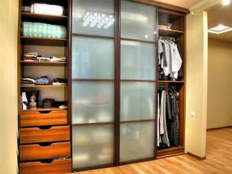- Das Vorhandensein einer großen Anzahl von verschiedenen Büros, Regalen und Schubladen macht den Schrank zu einer Alternative zu einer Garderobe.