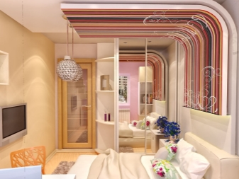 Ein guter Empfang, um den Raum optisch zu vergrößern, ist die Verwendung von Spiegeln im Innenraum (z. B. ein Schrank mit einem großen Spiegel in den Türen). Nach dem gleichen Prinzip verwenden Sie Glas und glänzende Oberflächen - zum Beispiel glänzende Spanndecken. Es ist jedoch wichtig, dass die Farbe in Pastellfarben sanft ist. Ansonsten können Sie einen unangenehmen Drückeffekt erzielen.
