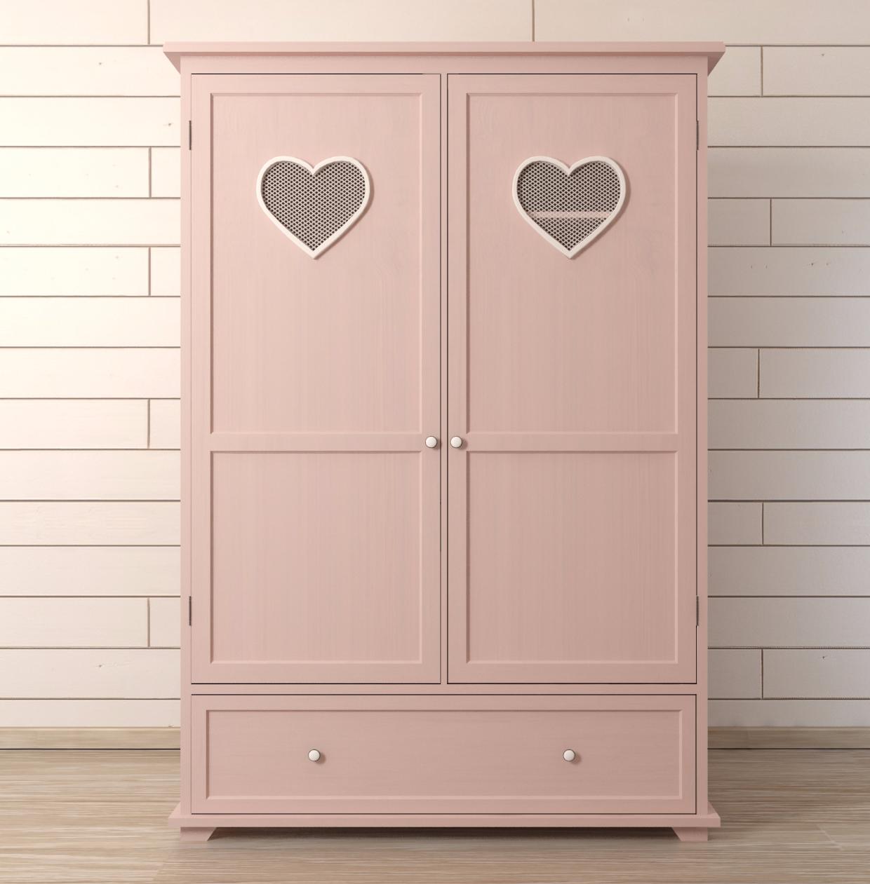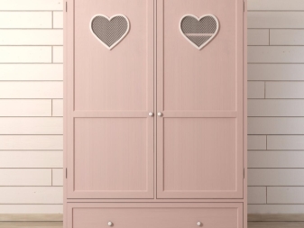- Doppel-Kleiderschrank mit einem trendigen Design. Dieser Entwurf wird in einer universellen weißen Farbe gemalt, die in jedem Innenraum organisch schaut. Kleine Herzen sind an den Türen des Schranks ausgeschnitten, was ein Modell von Originalität und Romantik hinzufügt. Diese Option ist perfekt für ein Zimmer mit einem kleinen Mädchen oder einem Schlafzimmer. Am unteren Rand des Designs ist eine breite Schublade.