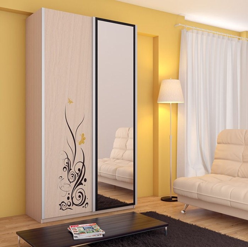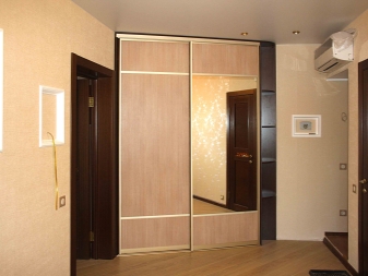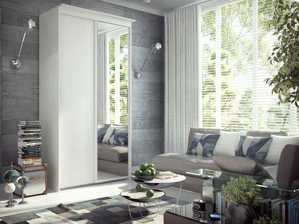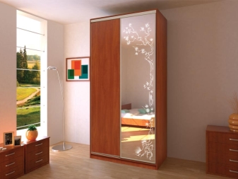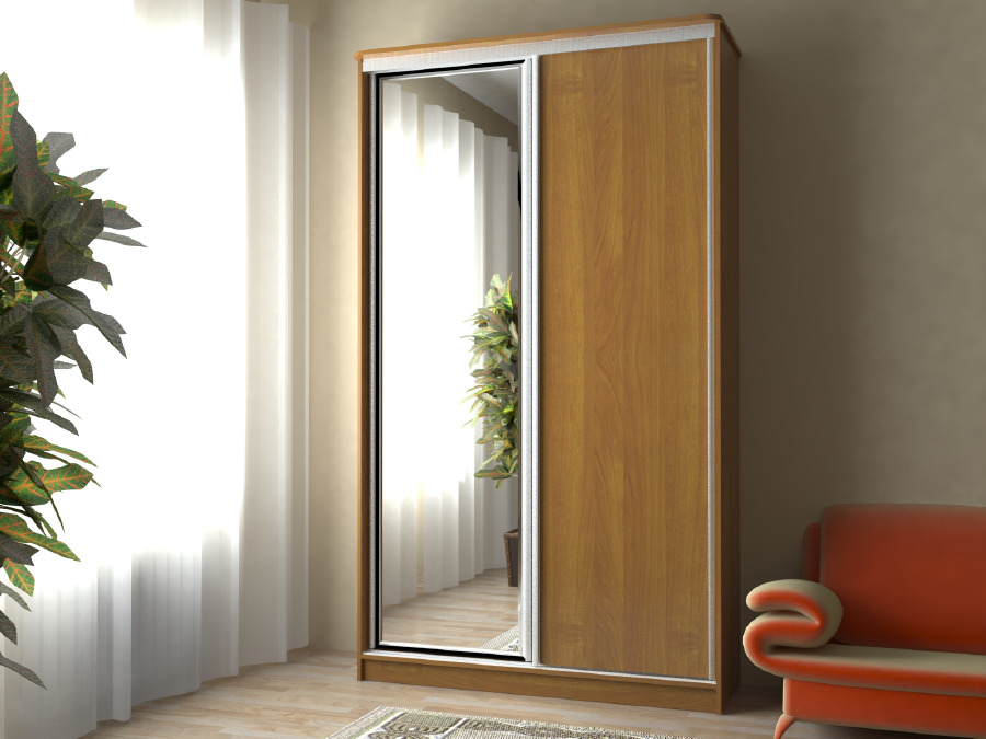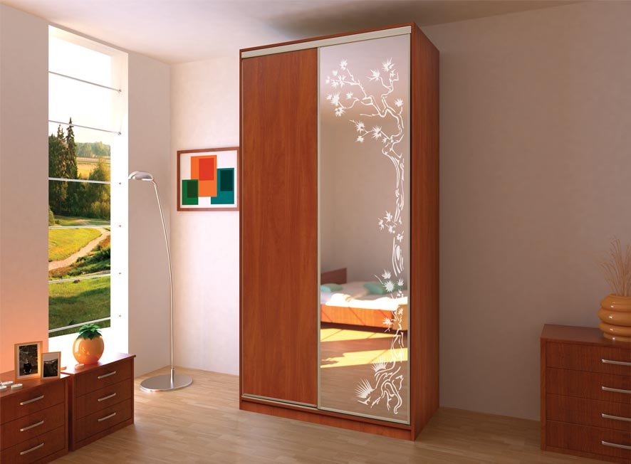 - Zweitüriger Kleiderschrank mit einem Spiegel. Dieses Modell zeichnet sich durch maximale Zurückhaltung und Funktionalität aus. Das Design ist aus Holz, auf einem der Ventile ist ein großer Spiegel. Dieser Schrank ist ideal für Flure und Schlafzimmer.