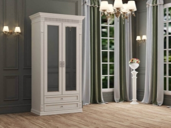 - Ergonomisch. Die Konfiguration des Schrankes mit zwei Türen bietet viel Platz für Ergänzungen. Sie können bequeme Fächer, Hilfsregale, Stangen, Haken und Aufhänger innerhalb der Möbel setzen. Moderne Geschäfte haben alles, um die Lagerung von Dingen so bequem wie möglich zu organisieren. Auch im Angebot sind Modelle mit Spiegeln.
