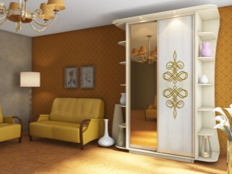 Auch mit Hilfe einer solchen Konstruktion ist es möglich, den Raum effektiv in zwei funktionale Bereiche aufzuteilen, zum Beispiel ein Wohnzimmer und eine Küche. Einige installieren sogar einen 2-türigen Schrank als Rahmen für die Türöffnung. So stellt sich eine Art Portal heraus. Es sieht sehr interessant und ungewöhnlich aus. Selbst in einem modernen Geschäft können Sie für noch mehr Platzeinsparungen Montage- und Bodendesign auswählen.