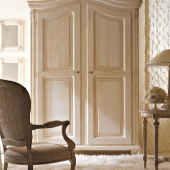 Fans des Empire-Stils werden hölzerne Doppel-Flügel-Kleiderschränke mit einer glänzenden glänzenden Oberfläche mögen. Dekorative geschnitzte und vergoldete Elemente werden harmonisch mit solchen Gegenständen kombiniert.