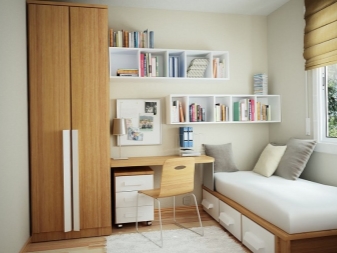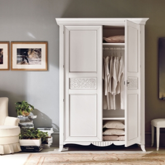 Beim Bedienen von Möbeln im Schlafzimmer in den Regalen können neben der Kleidung auch mehrere Sätze Bettwäsche gelegt werden. Es wird besonders praktisch sein Doppelgarderobe für das Kinderzimmer, weil es nicht viel Platz beansprucht und es Ihnen ermöglicht, nicht nur Kleidung, sondern auch Spielzeug zu lagern.