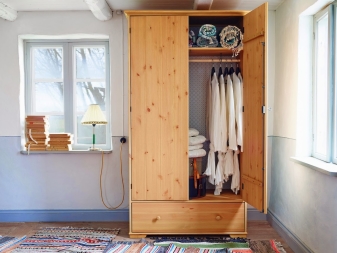 - Um zu vermeiden, eine Masse von unnötigen Dingen zu speichern und nur tatsächliche Kleidung zu platzieren, ist es nicht notwendig, ein Scharnierprodukt mit Entresolen in einem kleinen Raum zu stellen;
