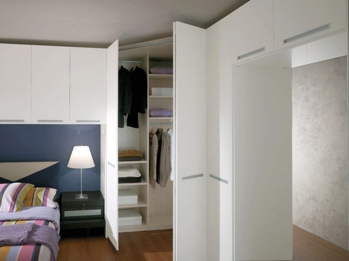 Wenn die Dimensionen des Raumes erlauben, wird eine gute Wahl mehr sein Geräumiges Eckmodell. Gleichzeitig wird eine kompetent durchdachte Füllung das Problem lösen, Kleidungsstücke bequem aus den Tiefen der Ecke zu entfernen.