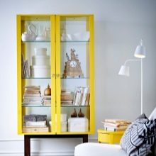 - Gelber Vitrinenschrank. Solch eine helle und stilvolle Garderobe wird eine echte Dekoration Ihres Hauses werden. Die Türen aus transparentem Glas werden den Inhalt der Regale effektiv demonstrieren. Gleichzeitig schützen sie zuverlässig Gegenstände vor Staub und unbehaglichen Bewegungen von Haushalten. Es wird perfekt sein, wenn solch ein fröhlicher Schatten in anderen Einrichtungsgegenständen erscheint. Funktionalität und originelles Design des Designs werden den Besitzer begeistern.