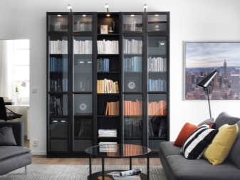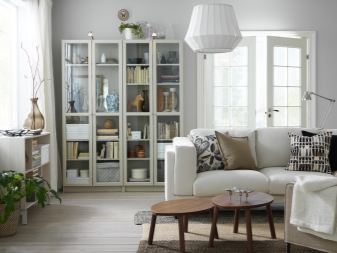 Auch im Bereich gibt es spezielle Vitrinen, die einfach erstellt werden, um Ihre schönen Dinge zu präsentieren. Zum Beispiel für einen alten guten Service, eine Sammlung von Briefmarken, für seltene Bücher sowie Pokale und Auszeichnungen für verschiedene Leistungen. Hochregale sind ideal für die optische Trennung des Raumes in mehrere Teile. Dies ist eine gute Möglichkeit, Dinge zu organisieren und Studio Apartments zu zonen. Sehr beliebt sind Kanister auf Rädern, Klapp- und Faltschränke.