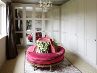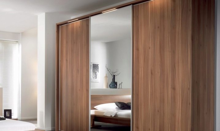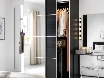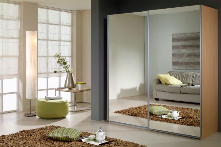 Die aufgeführten Materialtypen sind perfekt mit Spiegeln kombiniert. Ein großer Kleiderschrank mit Spiegeltüren wird dazu beitragen, jeden Raum optisch zu erweitern. Außerdem müssen Sie nicht nach einem Platz suchen, um einen Spiegel zu setzen. Diese Garderobe ergänzt das Schlafzimmer und den Flur perfekt.