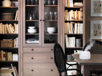 Auch im Ikea-Katalog finden Sie mehr Budgetoptionen. Es können reine Spanplatten (Spanplatten) in Reinform oder Spanplatten mit einer speziellen Folie - Spanplatte sein. Solche Materialien sind dem echten Baum sehr ähnlich. Gleichzeitig sind ihre Kosten deutlich niedriger als bei natürlichen Rohstoffen. Wir sollten jedoch nicht vergessen, dass die Haltbarkeit solcher Schränke deutlich geringer sein wird als bei Holzgegenstücken. Spanplatte hat Angst vor Wasser.Bei Kontakt des Materials mit Feuchtigkeit quillt es sofort auf und verschlechtert sich, was das Aussehen des Gehäuses erheblich beeinträchtigt. Bei richtiger Wartung und Pflege kann eine solche Konstruktion jedoch ein würdiger Ersatz für teurere Schränke sein.