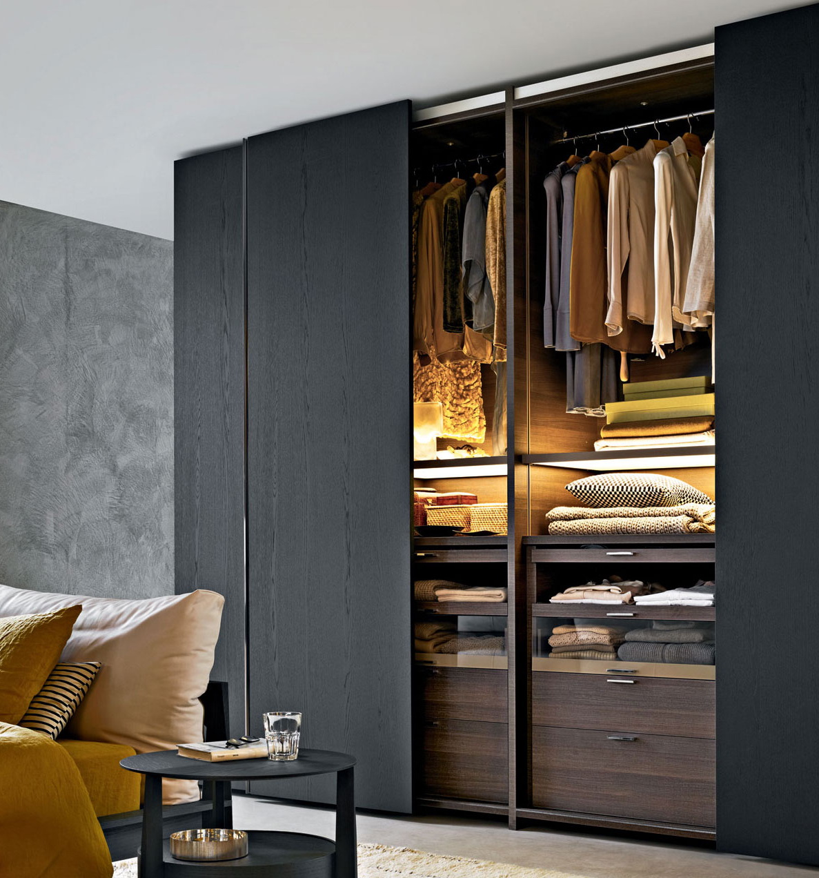Kästen für Zwischengeschosse helfen, Kleidung außerhalb der Saison und andere Dinge, die Sie nicht oft benutzen, rational zu organisieren. Zusätzliche Haken und Kleiderbügel sind nützlich für die Organisation von kleinen Accessoires (Handschuhe, Schlüssel, Hüte, Regenschirme). Auch beliebte einziehbare Querstange zur Aufbewahrung von Krawatten oder Hosen. Kurz gesagt, das Unternehmen hat alles bis ins kleinste Detail bereitgestellt, damit Sie sich so wohl wie möglich fühlen und die Möbel einfach nutzen können.