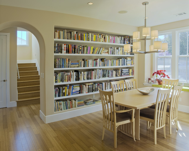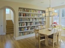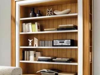 Eingebaute Bücherregale haben in der Regel eine Schiebetürkonstruktion. Sie sind vollständig in den Raum eingebettet und befinden sich in einer Nische von der Decke bis zum Boden.Solche Modelle haben normalerweise kein oberes und unteres Panel. Die wichtigsten sind hier die Seiten- und Rückwände. Alle Seiten- und Rückwände sind an Boden, Wänden und Decke angebracht. Dies ist ein sehr robustes Design. Sie können sich keine Sorgen machen, dass der Schrank fällt und Ihre Bücher beschädigt werden.