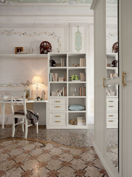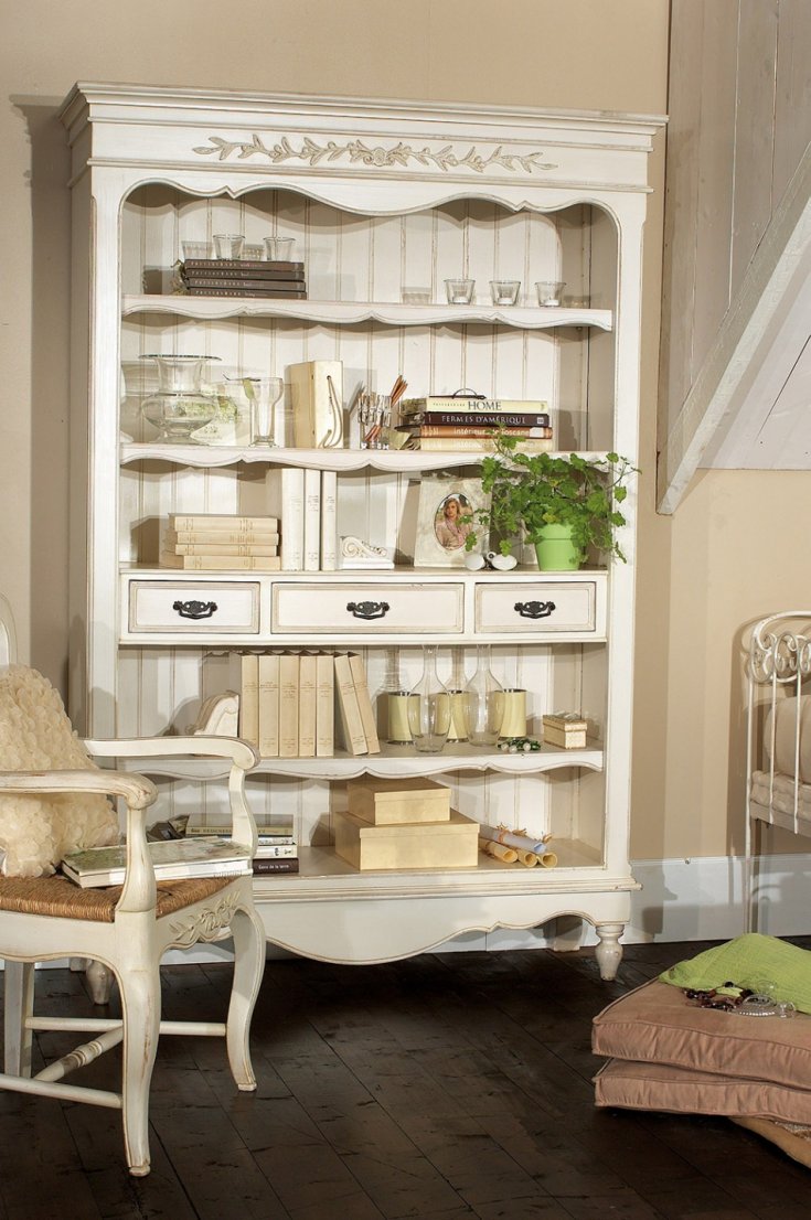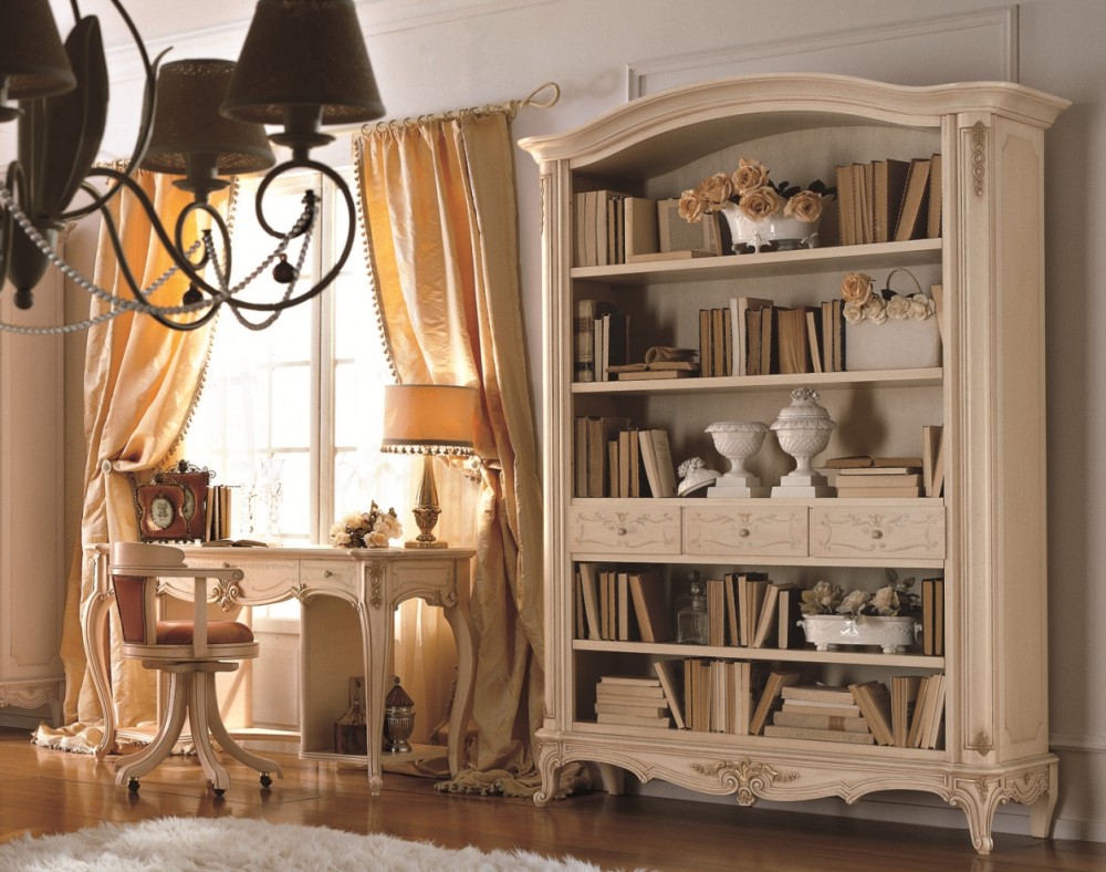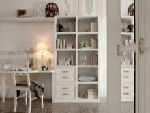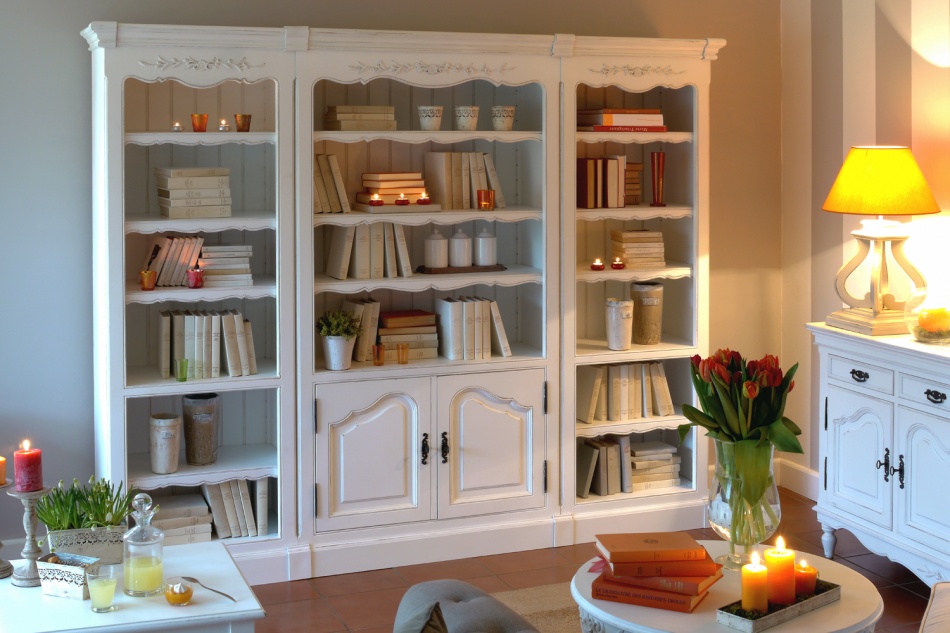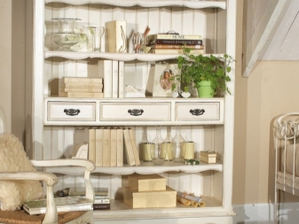 In dem Raum, der im Stil der "Provence" eingerichtet ist, müssen Sie nur leichte, elegante Bücherschränke kaufen. Es kann beige, milchig, hellbraun und sogar rosa Regal sein. Der Schrank sollte nicht zu hoch sein. Es ist besser, wenn es sich um schmale Modelle handelt. Für das Interieur im Stil der Provence passen Möbel mit Vintage-Lackierung.