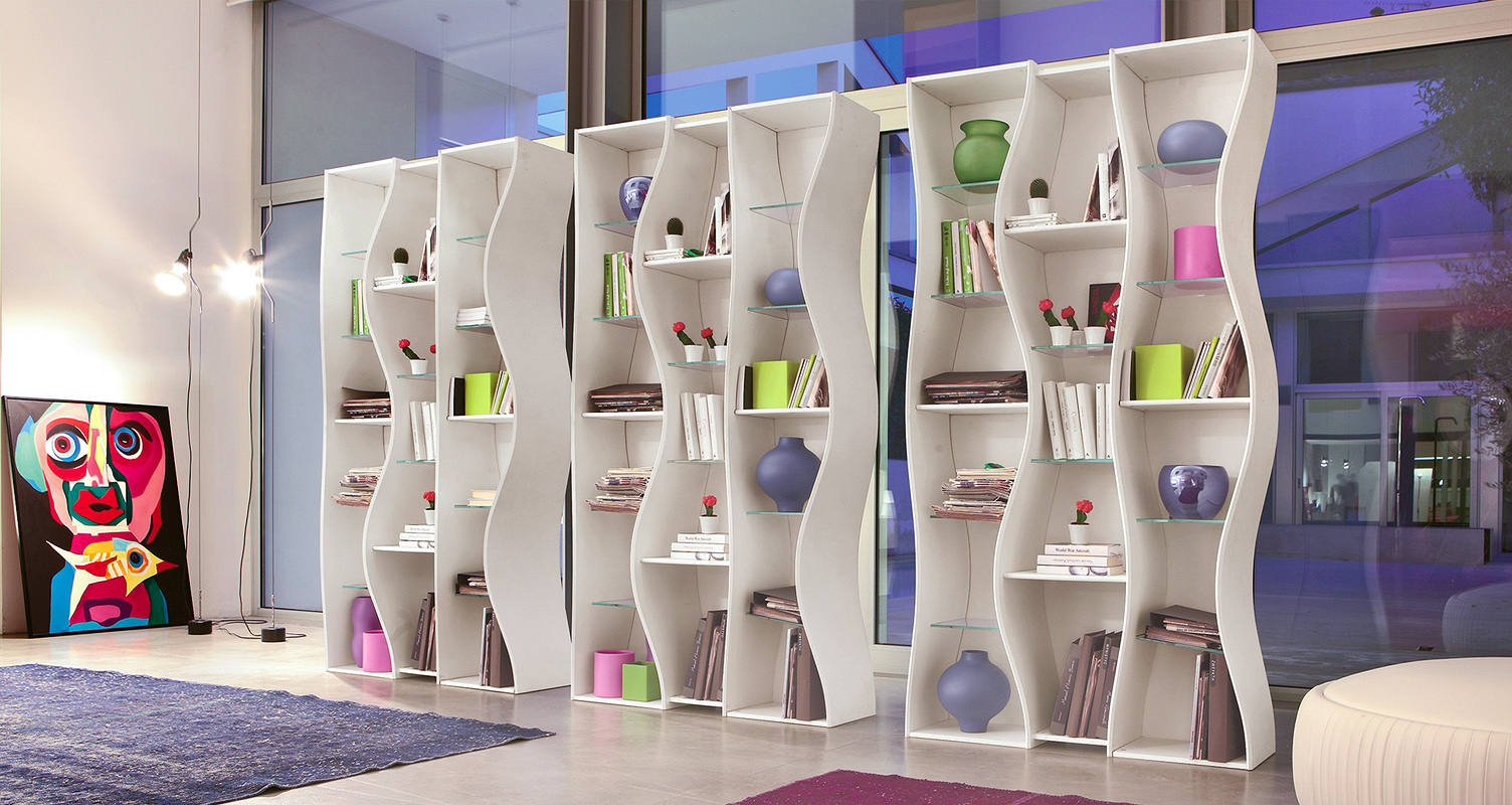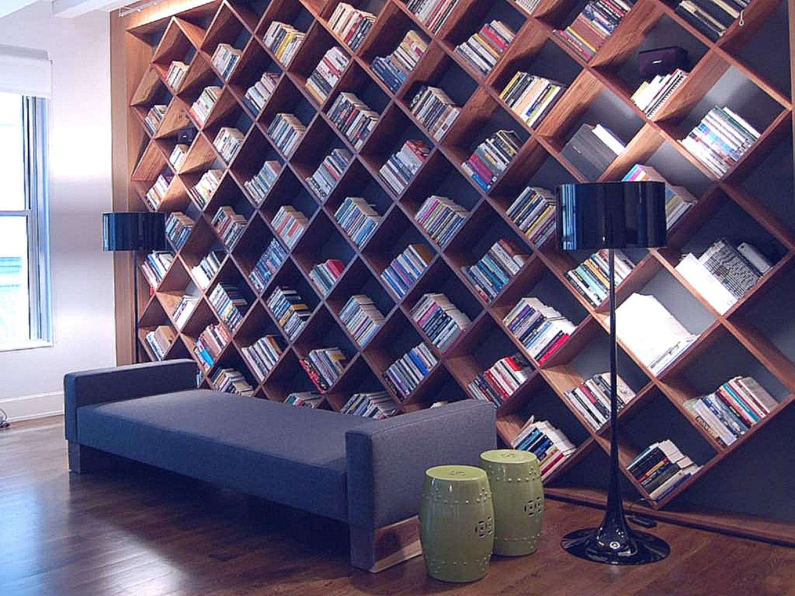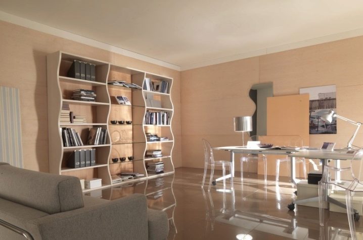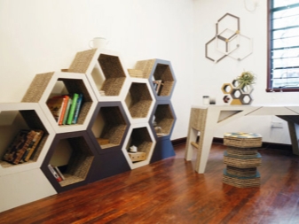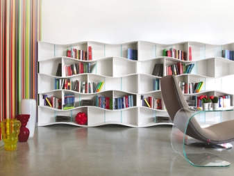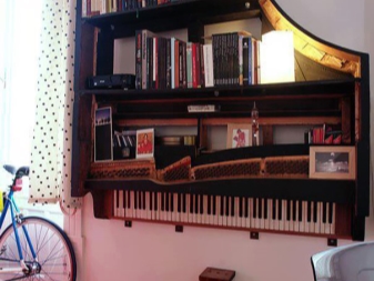 Einige Designer bieten Wabenkabinen an.In der Regel sind sie sogar aus warmen gelblichen Materialien gefertigt. Auch Designer stellen ungewöhnliche Racks mit schrägen Wänden dar. Sie ähneln Regalen, die vom Wind verschoben sind. Schauen Sie sich sehr ungewöhnliche Bücherregale, die in Form eines Klaviers gemacht sind. Sie sind eine luxuriöse Ergänzung zu den klassisch eingerichteten Zimmern.