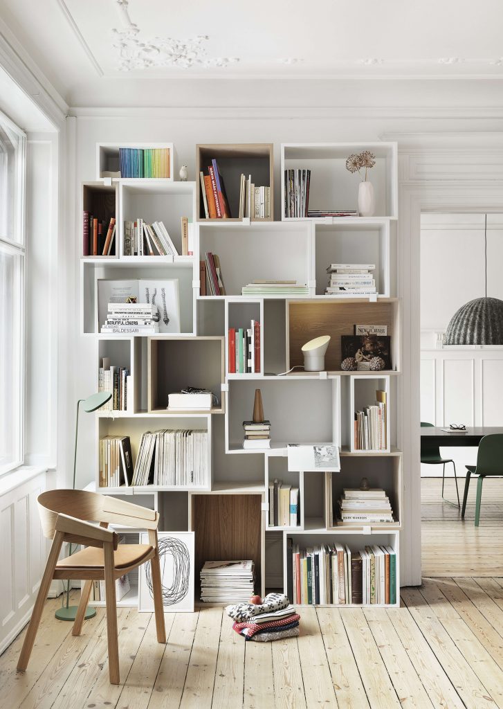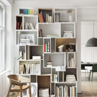 Auch Designer bieten andere mutige Lösungen an. Es ist interessant, die Bücherregale zu betrachten, die nicht in einer geraden Linie parallel zum Boden angeordnet sind, sondern in verschiedenen Winkeln, als wären sie zufällig an der Wand angeordnet. Bücherregale sehen sehr schön aus, in denen sich offene Regale mit offenen Strukturen abwechseln.