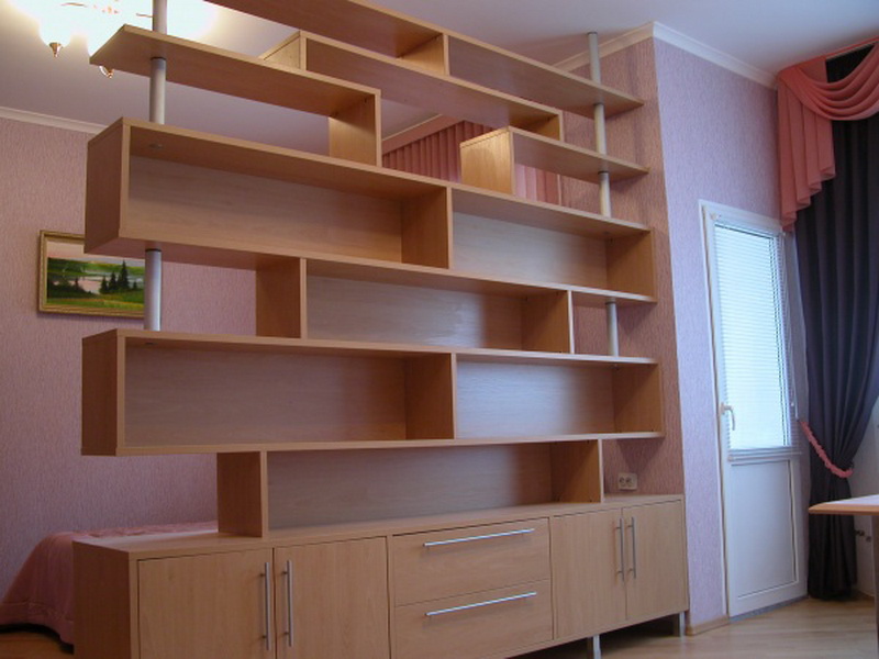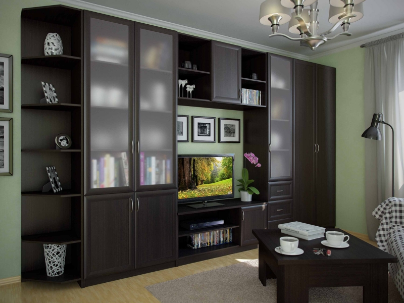 Diese Lösung eignet sich perfekt zum Aufbewahren von Büchern und Kleidung. Es kann in jedem Wohnzimmer und sogar im Schlafzimmer installiert werden. Auch in der Halle sind oft Modelle mit Platz für den Fernseher installiert.