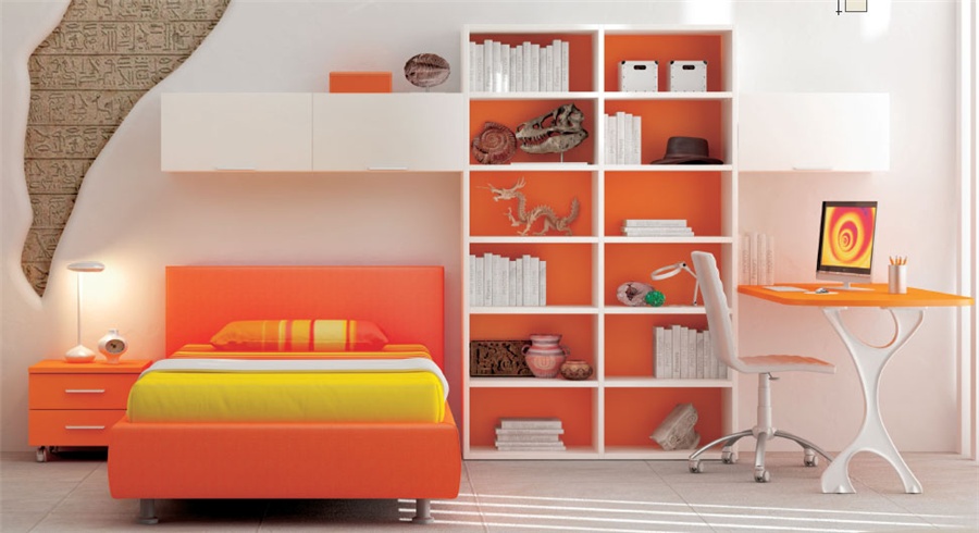 Bücherregale fügen sich funktional in jedes Kinderzimmer ein. In diesem Fall erhalten Sie hell dekorierte Modelle. Für dieses Interieur sind Farbprofile perfekt, die sich mit dem Lichtdesign anderer großer Möbel überschneiden.