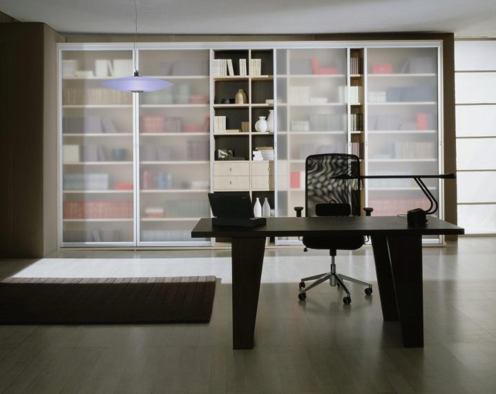 Ein Bücherregal mit Milchglastüren sieht im Innenraum sehr schön aus.Hinter ihm können Sie einige Bücher vor neugierigen Blicken verstecken. Zur gleichen Zeit kann nicht jeder den internen Inhalt sehen, aber das Bücherregal wird das Innere des Raumes mit Leichtigkeit ergänzen.