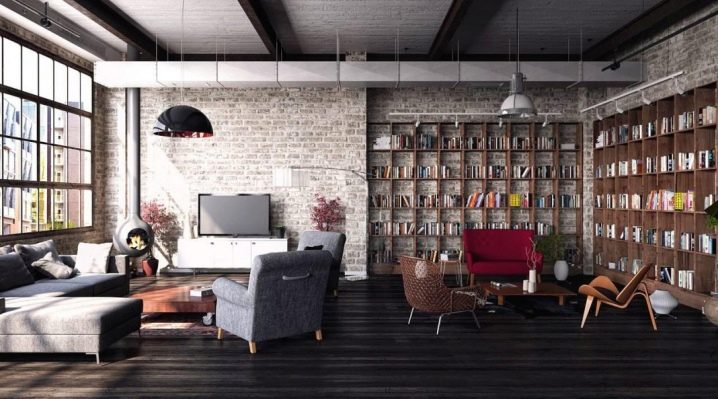 Der Loft-Stil Kleiderschrank sollte ein wenig schlampig aussehen. Es kann nach dem Zufallsprinzip Regale platziert werden. Perfekt angepasste Schränke mit Regalen und Regalen in Schachbrettmuster. Für diesen Stil eignen sich eher massive Möbel aus dunklen Materialien.