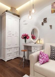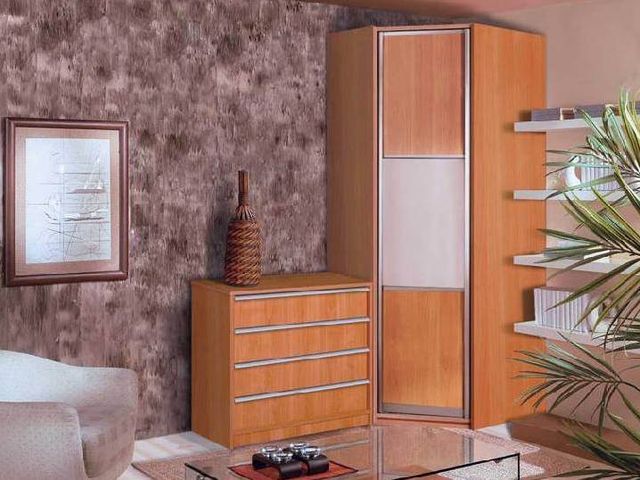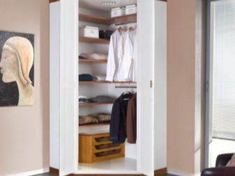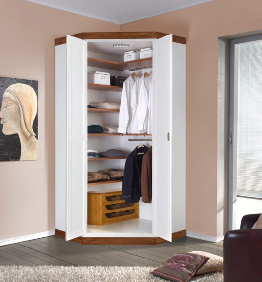 Vergessen Sie nicht, dass die Schränke nicht nur rechteckig, sondern auch eckig sind. Ecke in der Herstellung von genau den angegebenen Parametern sparen Sie Platz. Das Produkt kann durch ein Nachtschränkchen oder Kommode neben dem Bett, getrennt genommen werden.Versuchen Sie im Flur, es so zu installieren, dass Sie sich so bequem wie möglich draußen versammeln können, so dass Sie leicht zu allem gelangen können.