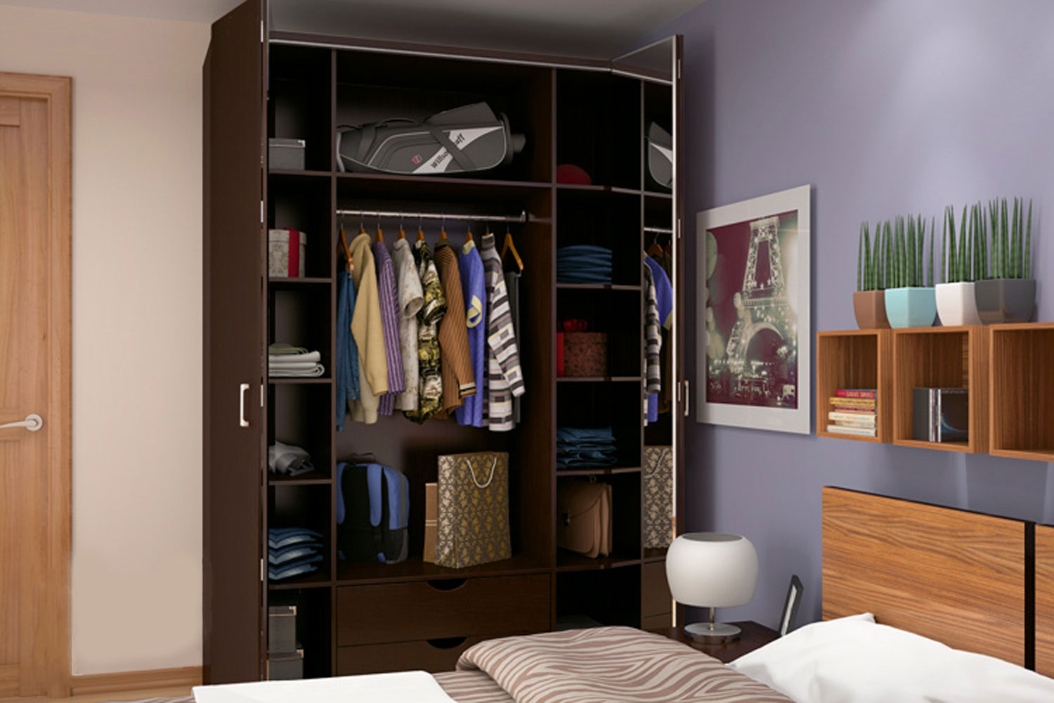 - Wenn Sie im Schlafzimmer eine Garderobe wählen, denken Sie daran, dass hier maximale Funktionalität wichtig ist, da Sie die meisten Ihrer Sachen darin aufbewahren müssen. Es sollte Regale, Zwischengeschoss, und die Bar und ausziehbare Schubladen sein. Sie können das Innere einer der Türen mit einem Spiegel ausstatten;