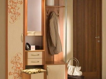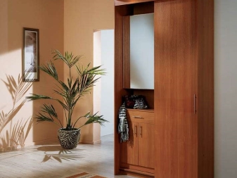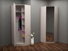 Hinter der einzelnen Tür eines Schrankes, der für den Gebrauch in einem Raum mit spezifischer Funktionalität bestimmt ist, ist in der Regel eine gewisse innere Füllung verborgen. Das Körperprodukt, das in einem schmalen Flur oder Kleiderschrank steht, muss mit einer Stange zum Aufhängen von Kleiderbügeln an saisonaler Kleidung versehen sein. Im unteren Fach können Sie Schuhe und Pflegeartikel platzieren. Ein Koffer oder ein Eckschrank mit einem Einsatz eines Ganzkörperspiegels an der Tür wird Ihnen nicht nur helfen, sich ordentlich zu kleiden, sondern auch die Grenzen des Raums optisch zu erweitern.
