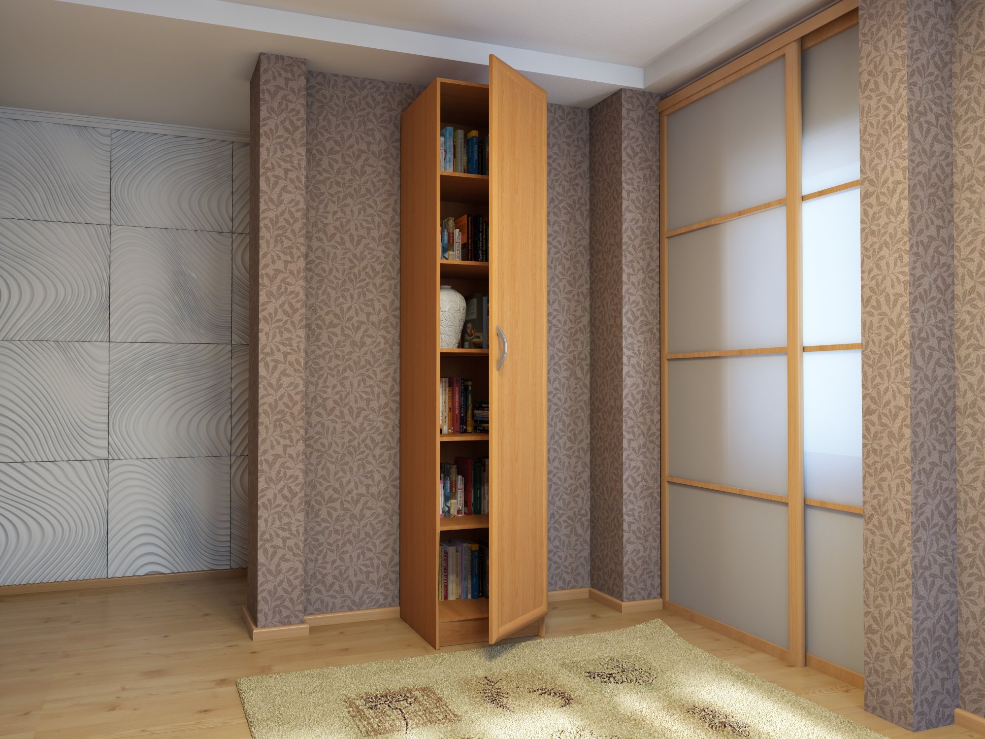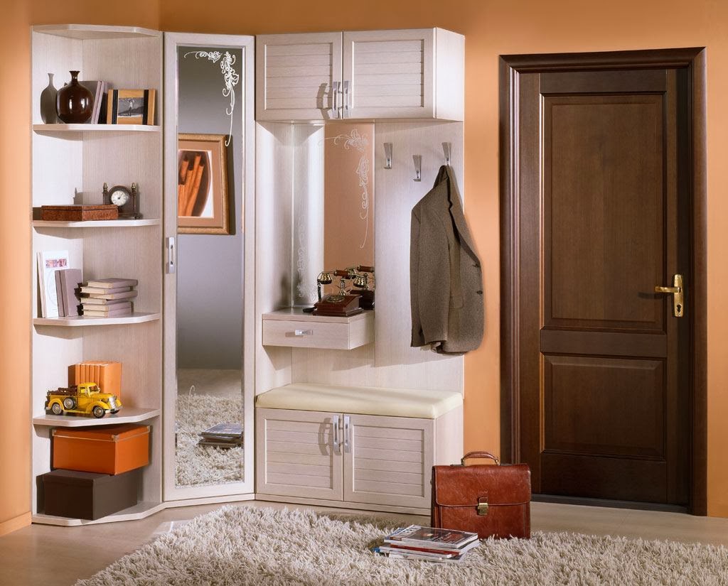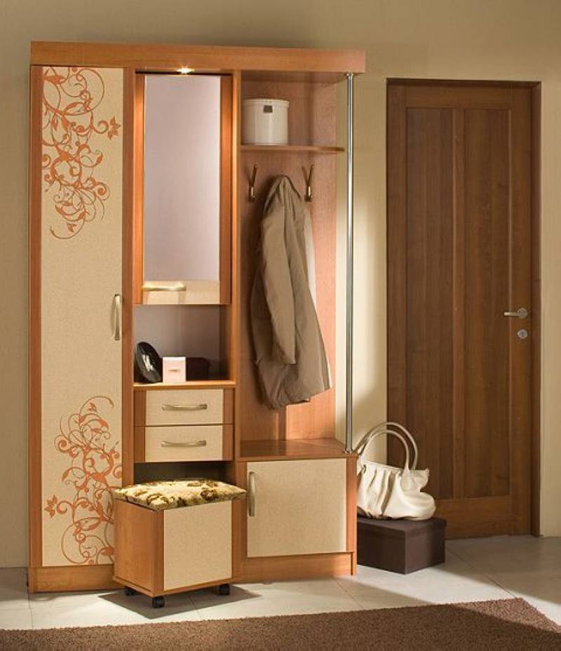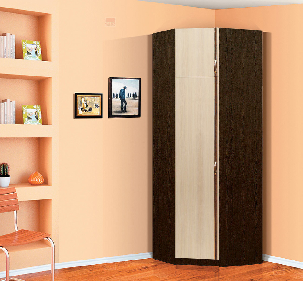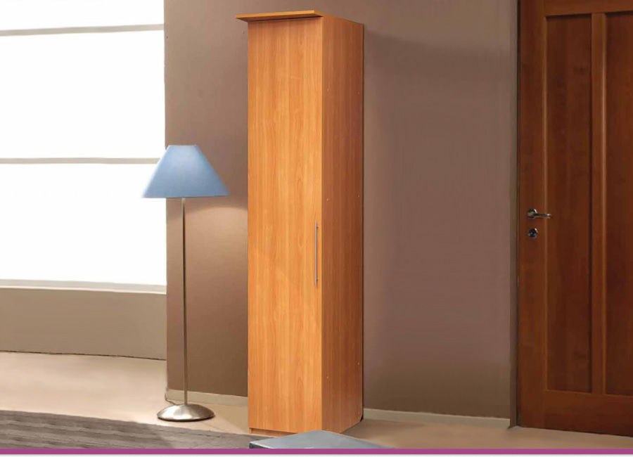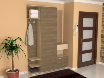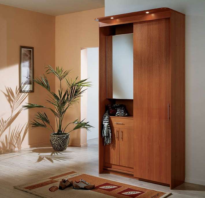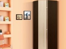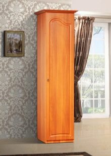 Die Garderobe im Inneren eines modernen Hauses oder einer Wohnung ist ein schlichtes Design mit einer Flügeltür.Wie jeder andere ist ein eintüriger Schrank meistens linear in der Form eines Kanisters mit einer kleinen Breite und einer großen Höhe. Diese Konstruktion ermöglicht eine wirtschaftliche Entsorgung einer schmalen Wand oder Nische. Zusätzlich kann die freie Ecke des Raumes mit einer flachen Eckstruktur mit einer Schärpe gefüllt werden, deren Draufsicht die Form eines Fünfecks mit einem rechten Winkel aufweist.